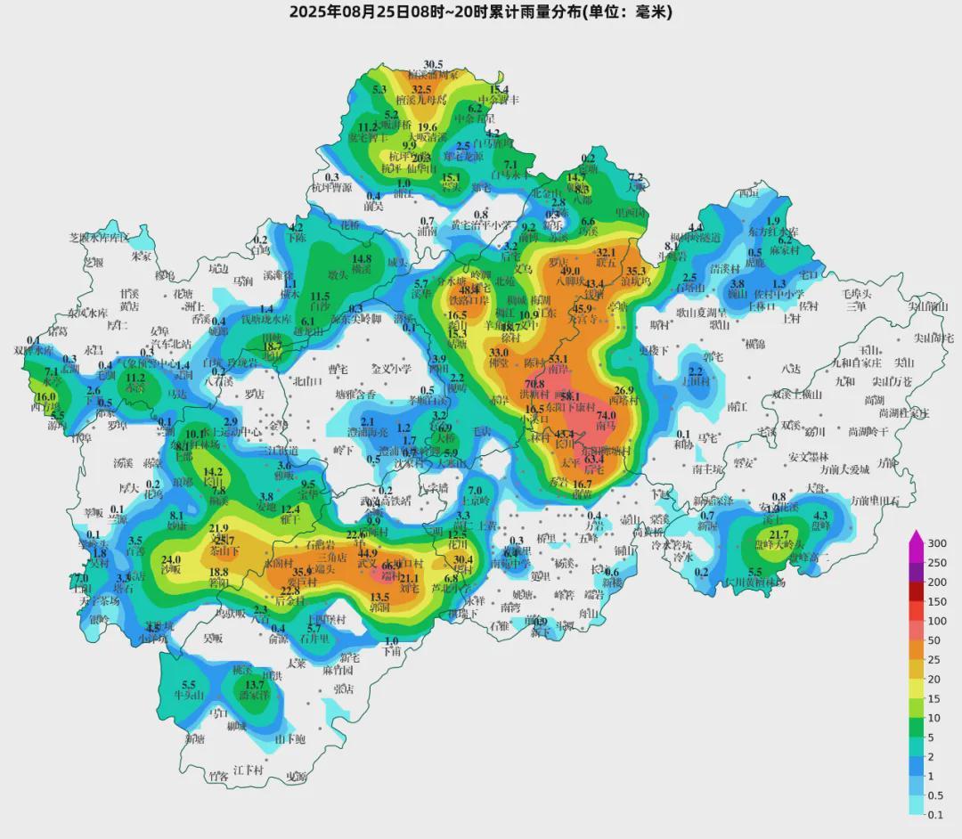 2025年8月25日08时至20时,全市平均面雨量5.8毫米,其中义乌12.7毫米、东阳8.3毫米、浦江7.8毫米、武义6.8毫米、永康5.0毫米、婺城4.8毫米、兰溪2.9毫米、磐安1.0毫米、金东0.5毫米。累计雨量20毫米以上的站有60个,30毫米以上的站有36个,50毫米以上的站有8个。
